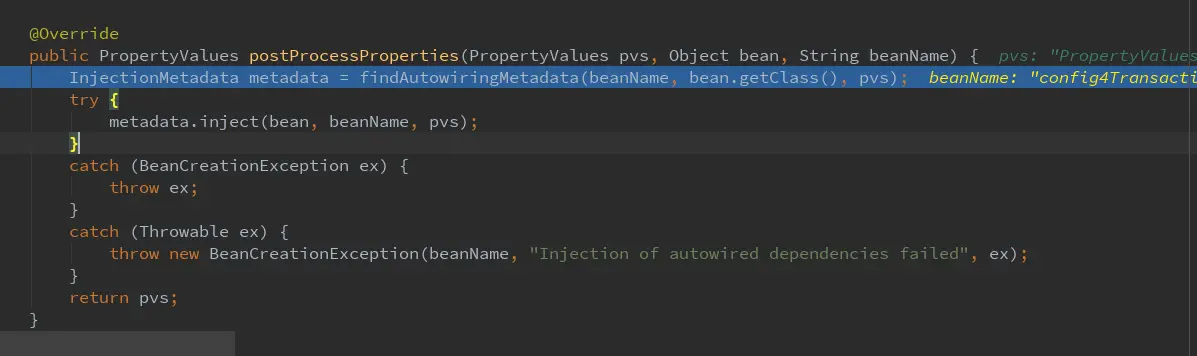 执行下去 进入postProcessProperties 首先找出所有的注解包括@Value @Autowired然后进行调用inject方法进行赋值 最终是通过反射实现最终赋值