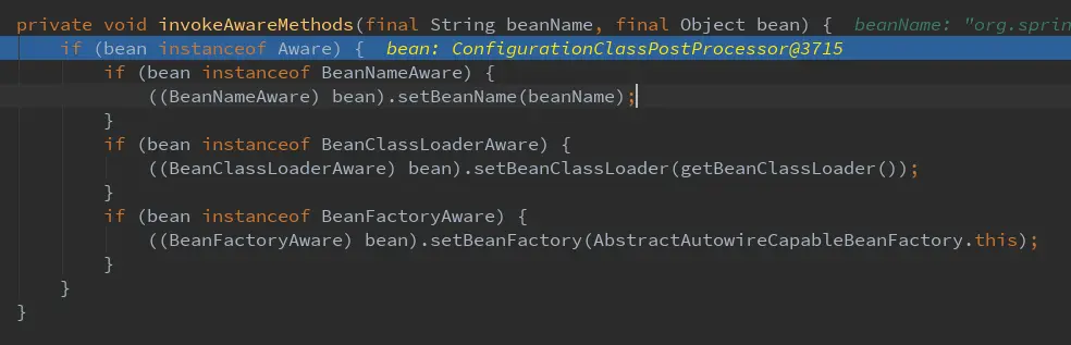 若 bean 实现了 BeanNameAware、BeanFactoryAware、BeanClassLoaderAware 等接口,则向 bean 中注入相关对象