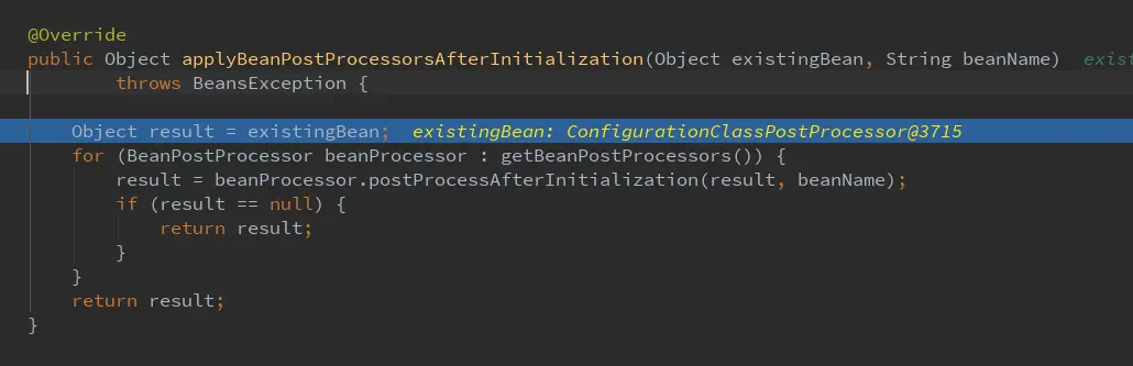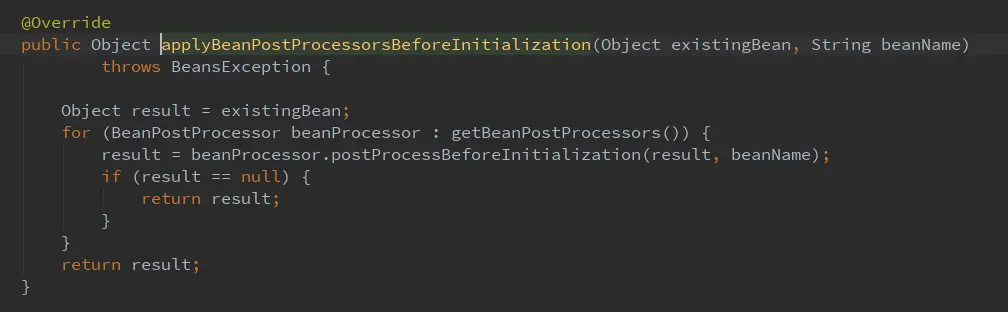 实例化前执行后置处理器对应的postProcessBeforeInitialization方法