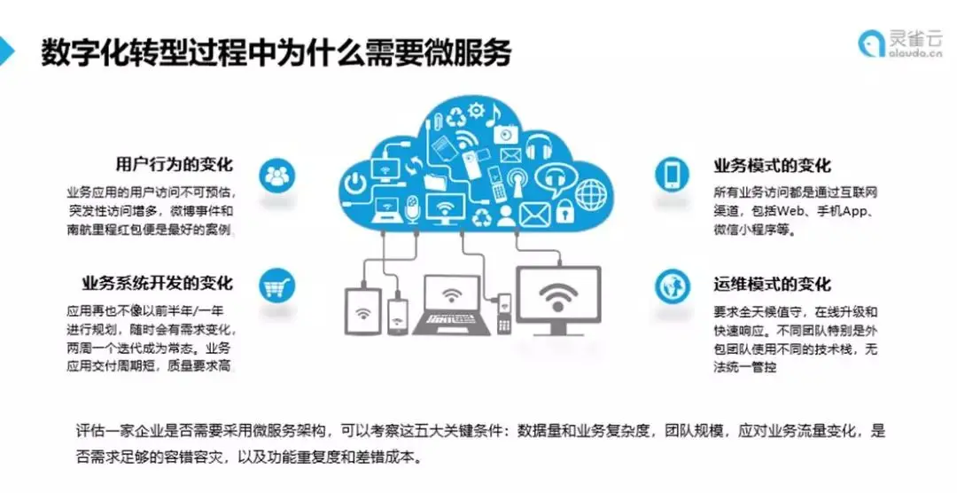 同时他也强调,微服务架构不是完美架构,有着自身的劣势,会带来系统复杂度的升高以及更高的运维要求,因此企业是否要演进到微服务架构,取决于五大关键因素:数据量和业务复杂度,团队规模,应对业务流量变化,是否需求足够的容错容灾,以及功能重复度和差错成本。