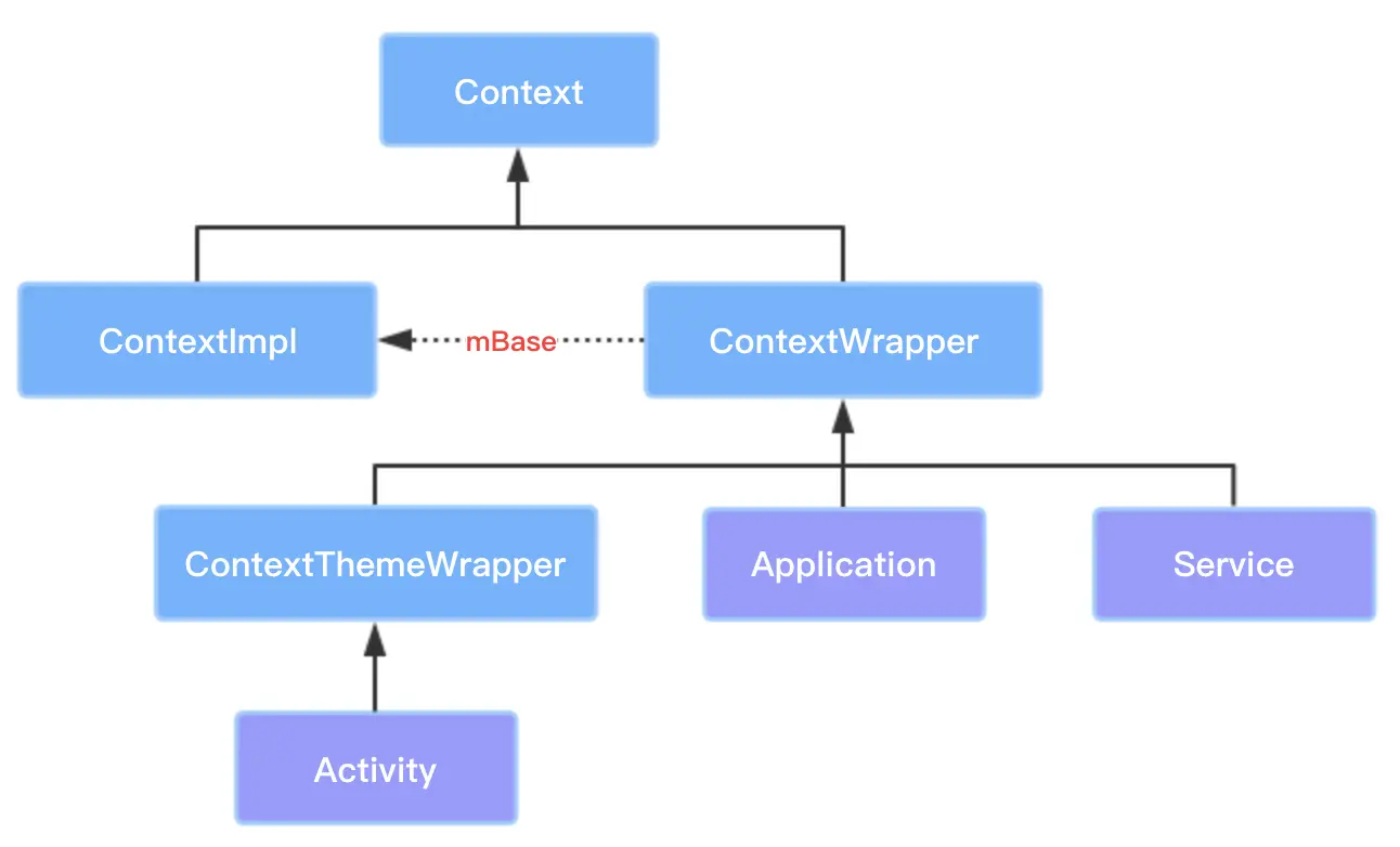 Application、Activity和Service的Context创建过程类似,都是先创建各自对应的ContextImpl对象,然后调用attach方法,该方法最终调用ContextWrapper的attachBaseContext方法,将创建的ContextImpl对象赋值给ContextWrapper的成员变量mBase。我们在开发中在Application或Activity或Service中调用Context的方法,实际都是调用mBase所指向的ContextImpl对象的方法,再结合上面给出的Context相关类的示图,就可以很清晰的理解它们之间的关系了。