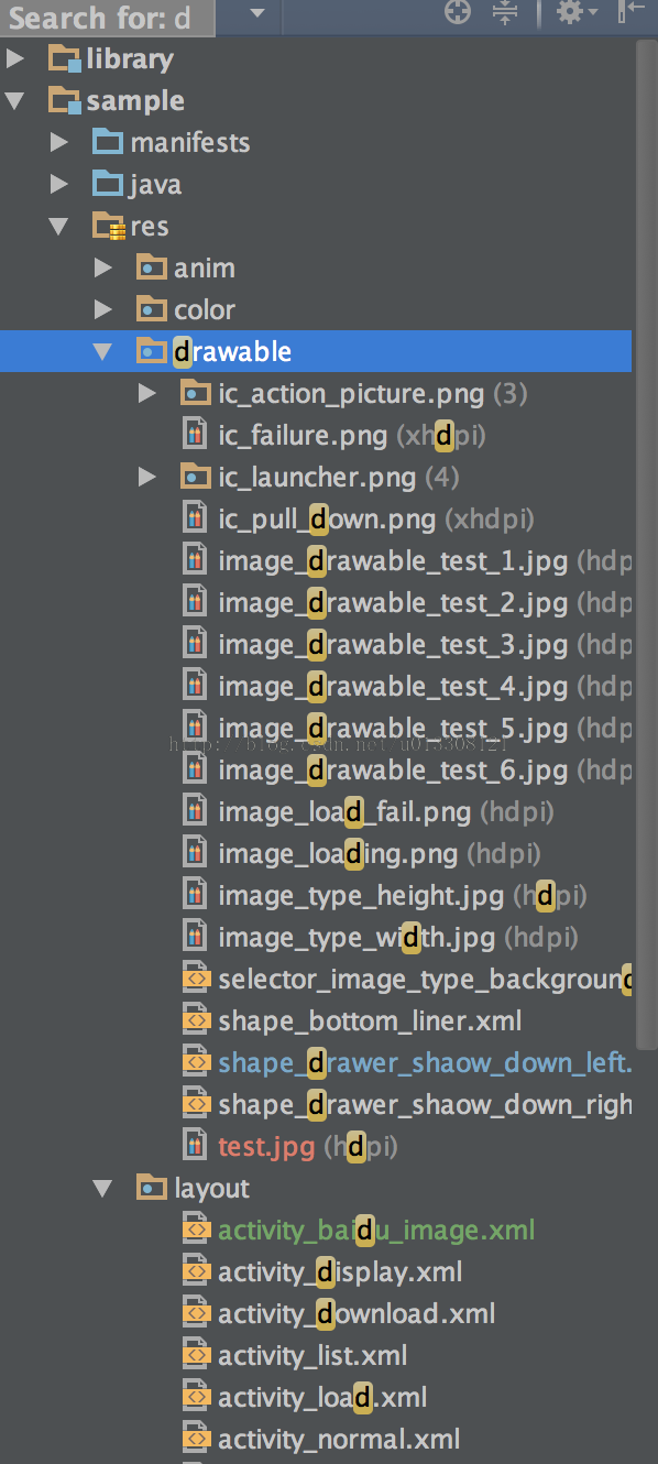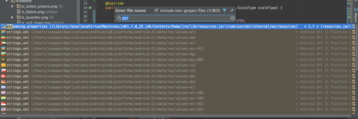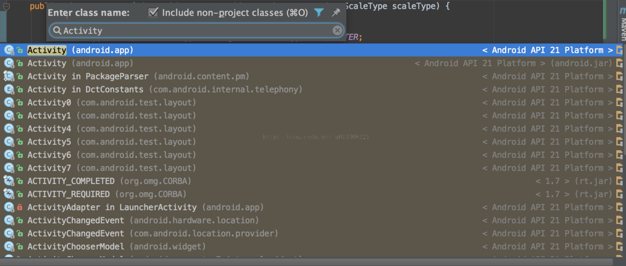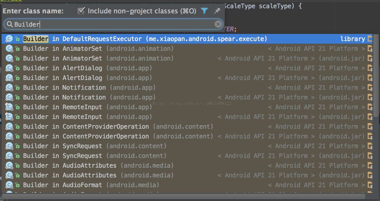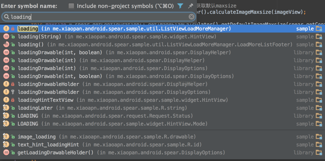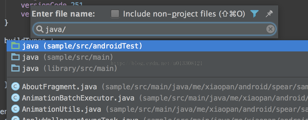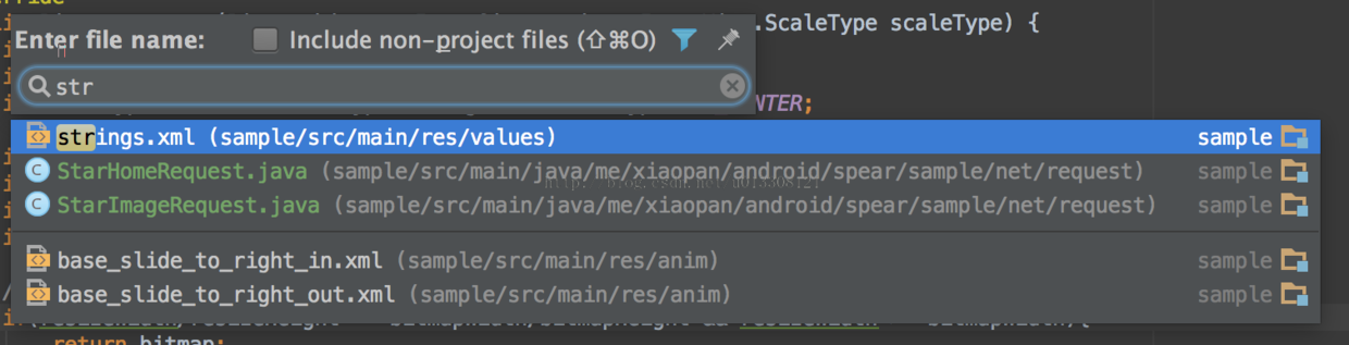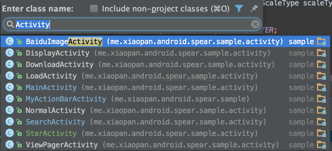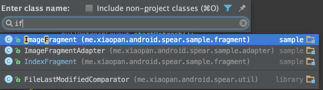 IDEA的搜索功能之所以强大首先是因为其支持跳跃式匹配关键词,也就是你在输入搜索关键词的时候不必全部输入,例如你想要查找ImageFragment.java,那么你只需输入if即可,如下图所示: