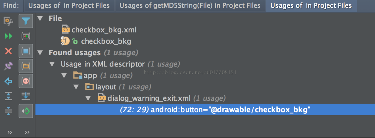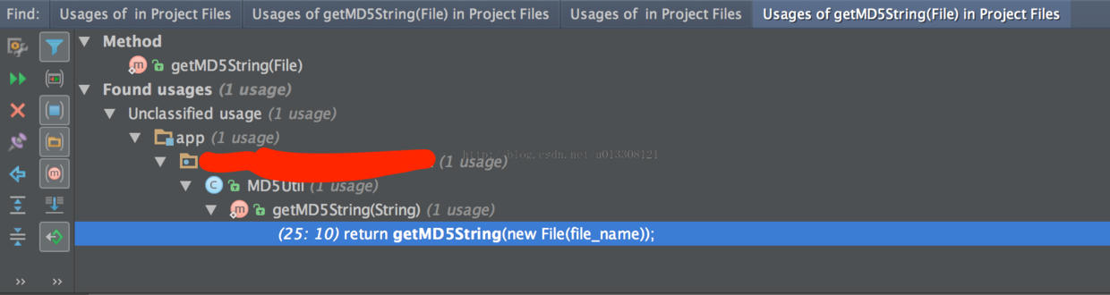 在你需要查看的目标上按下ALT+F7就可以在搜索所有被使用的地方,等价与Eclipse中的CMD+SHIFT+G快捷键,如下图所示: 查看文件的使用情况(在目录树上选中文件然后按下ALT+F7)