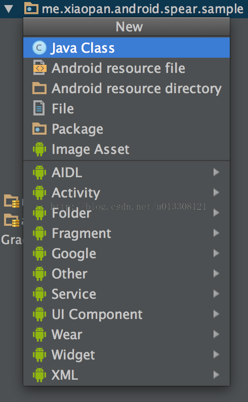 当我们需要新建文件的时候,需要先将焦点定位到目录上,然后按下CMD+N,AS会给你列出能在这个目录下创建的文件的类型,例如: 新建类