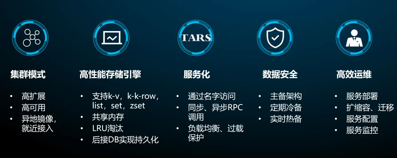 DCache主要用于高性能分布式缓存,数据采用内存存储,支持key-value,k-k-row,list,set,zset多种数据结构,通过连接后端DB实现数据持久化。采用集群模式,具有高扩展,高可用的特点,支持异地镜像,就近接入。基于TARS框架支持名字访问、同步、异步、单向RPC调用。同时具有一套可视化高效运维平台,助力开发和运维人员轻松完成服务部署、扩缩容、迁移,以及服务配置,服务调用质量监控。