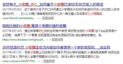 由于在百度搜索结果中最被用户关注的是网页标题和描述,而往往较能满足用户搜索需求且有吸引力的标题或者描述,越能获取更多的用户点击,从这一层面来说,整体点击率往往体现了网页标题和描述是否能满足用户需求,并且具有创意性。关于这两块内容如何写,也有很大的讲究,这里就不再展开了,只提供一个例子,让大家感受,哪个结果更受用户欢迎。百度搜索“小密圈”,某三个结果(某大神别打我,捂脸):