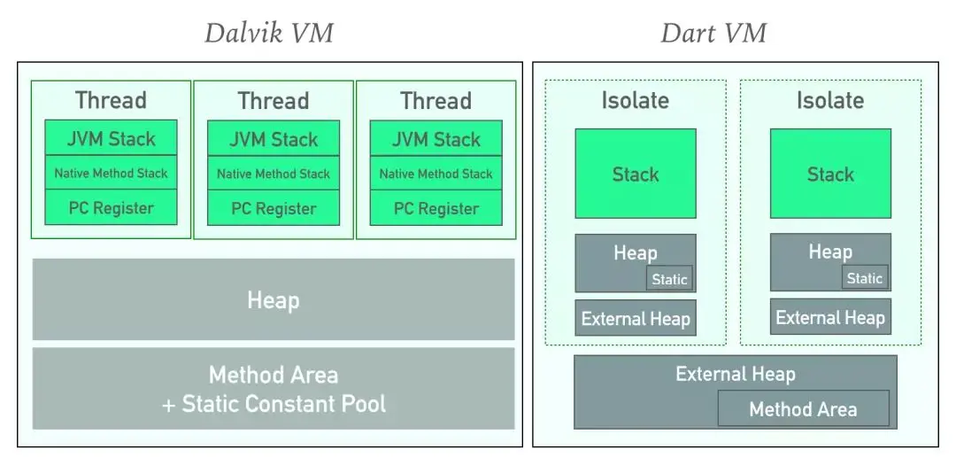和Java显著不同的是Dart的"线程"(Isolate)是不共享内存的,各自的堆(Heap)和栈(Stack)都是隔离的,并且是各自独立GC的,彼此之间通过消息通道来通信。Dart天然不存在数据竞争和变量状态同步的问题,整个Flutter Framework Widget的渲染过程都运行在一个isolate中。