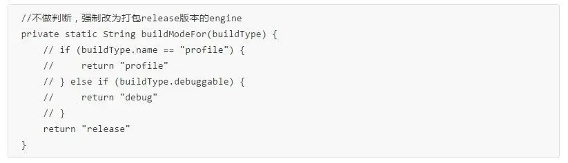 而Flutter Image Widget使用的是哪部分内存呢?我们用Flutter界面来做相同的测试。Flutter Engine的Debug版本和Release版本存在很大的性能差异,所以我们测试最好使用Release版本,但是,Release版本的Apk又不能使用Android profiler来观察内存,所以我们需要在Debug版本的Apk中打包一个Release版本的Flutter Engine, 可以修改flutter tool中的flutter.gradle来实现: