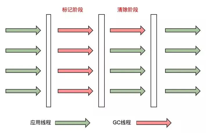 老年代(Old Generation): 在新生代的GC中“幸存”下来的对象,它们会被转移到老年代中。老年代存放生命力周期较长,内存较大的对象。老年代通常比新生代要大很多。老年代的GC回收采用“标记-清除”算法,分成标记和清除两个阶段。在标记阶段会触发停顿(stop the world),多线程并发的完成对垃圾对象的标记,降低标记阶段耗时。在清理阶段,由GC线程负责清理回收对象,和应用线程同时执行,不影响应用运行。
