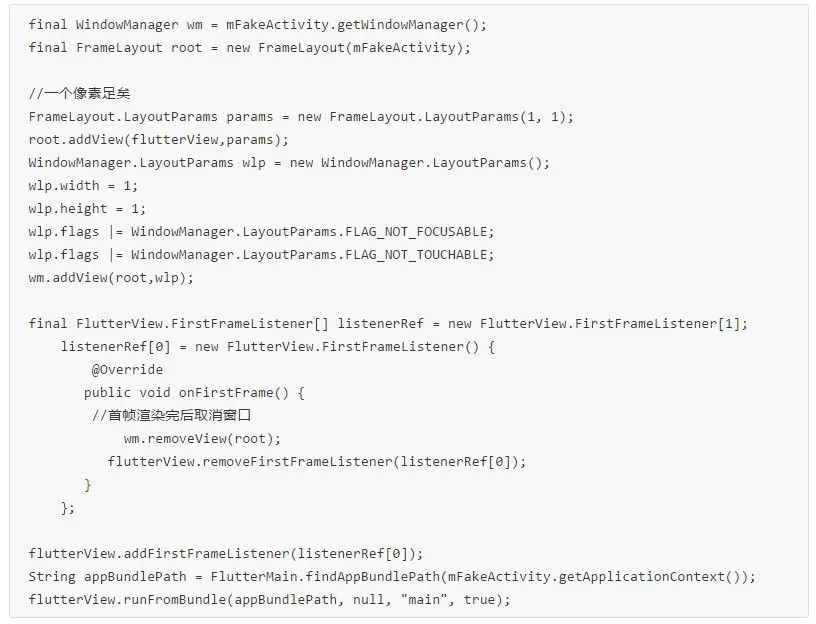 Flutter Framework中FlutterView是绑定Activity使用的,要复用FlutterView就必须能够把FlutterView单独拎出来使用。所幸现在FlutterView和Activity耦合程度并不很深,最关键的地方是FlutterNativeView必须attach一个Activity: