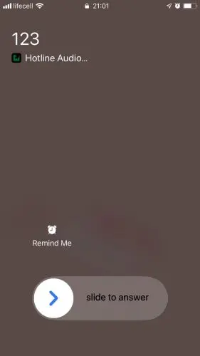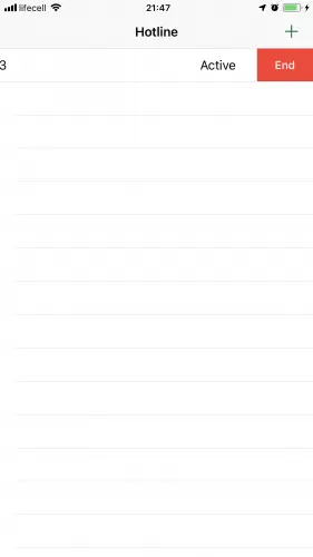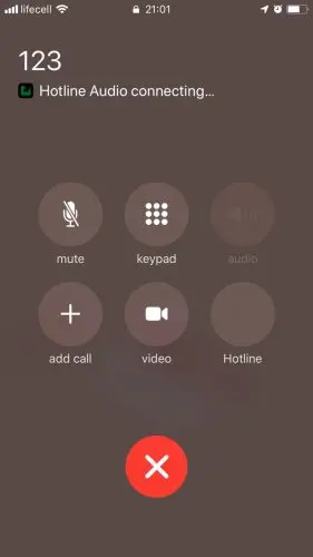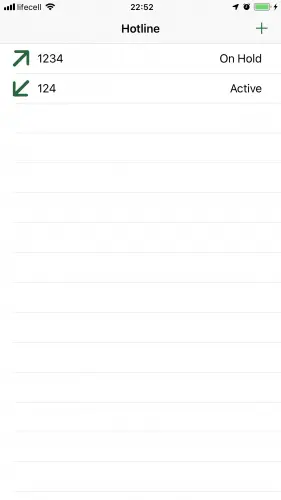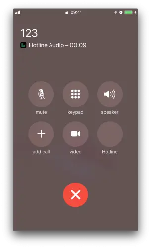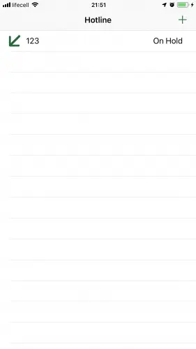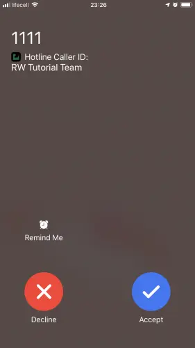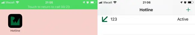 如果Hotline用户收到多个电话怎么办? 您可以通过先拨打拨出电话然后拨打来电并在来电进入之前按Home按钮来模拟此操作。此时,应用程序会向用户显示以下屏幕: