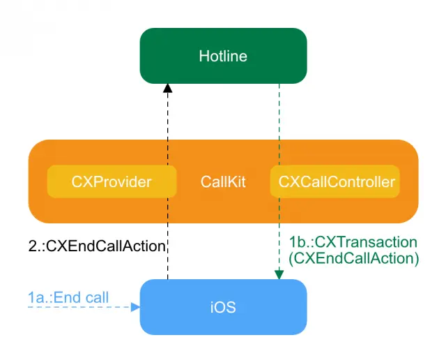 注意步骤1a和1b之间的区别。 当用户结束来自通话屏幕(1a)的呼叫时,系统自动将CXEndCallAction发送给provider。 但是,如果您想使用Hotline (1b)结束通话,那么你需要做的是将操作包装到事务中并从系统请求。 一旦系统处理了请求,它就会将CXEndCallAction发送回provider。