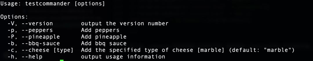 默认地,commander会自动创建-h的帮助文件,即利用每一个option的输入产生帮助文案。