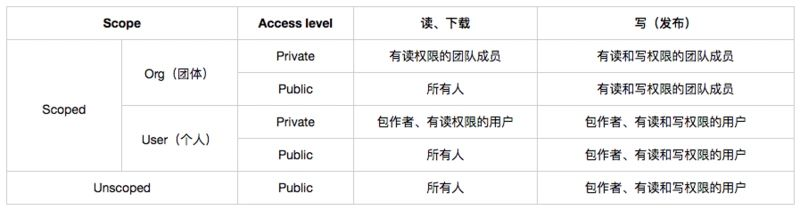 除了通常的包,还有一种是带有scope的包,vue-cli的3.0版本就是@vue开头的。这个scope是组织的名字。每一个带有scope的包有公有和私有之分,私有的需要付费给npm。