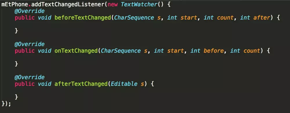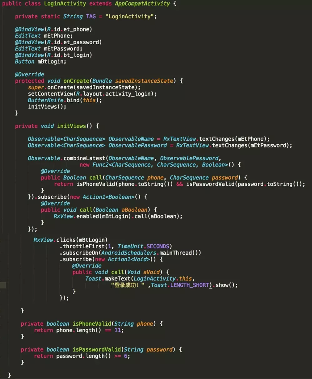 操作符combineLatest作用就是当多个Observables中的任何一个发射了一个数据时,通过一定的方法去组合多个Observables的最新数据,然后发射最终结果。 在本例中两个输入框只要内容发生变化,就会发送Observable然后我们在Fun2中利用我们的验证方法去判断输入框中最新的内容,最终返回是否可点击的结果。 这个例子我们也可以看到简洁之处。 我们使用RxTextView.textChanges(mEtPhone)就可以实现监听,而使用一般方法则像下面代码这样。(其实你可能只需要onTextChanged())