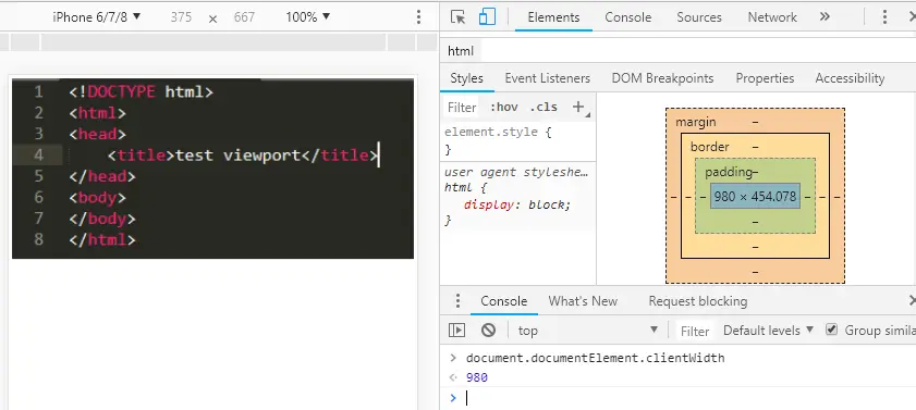 知道了通用方法进入代码的正题,写一个如图简单的HTML页面,在Chrome浏览器iPhone6模拟器下调试发现页面的可视区域宽为980px。