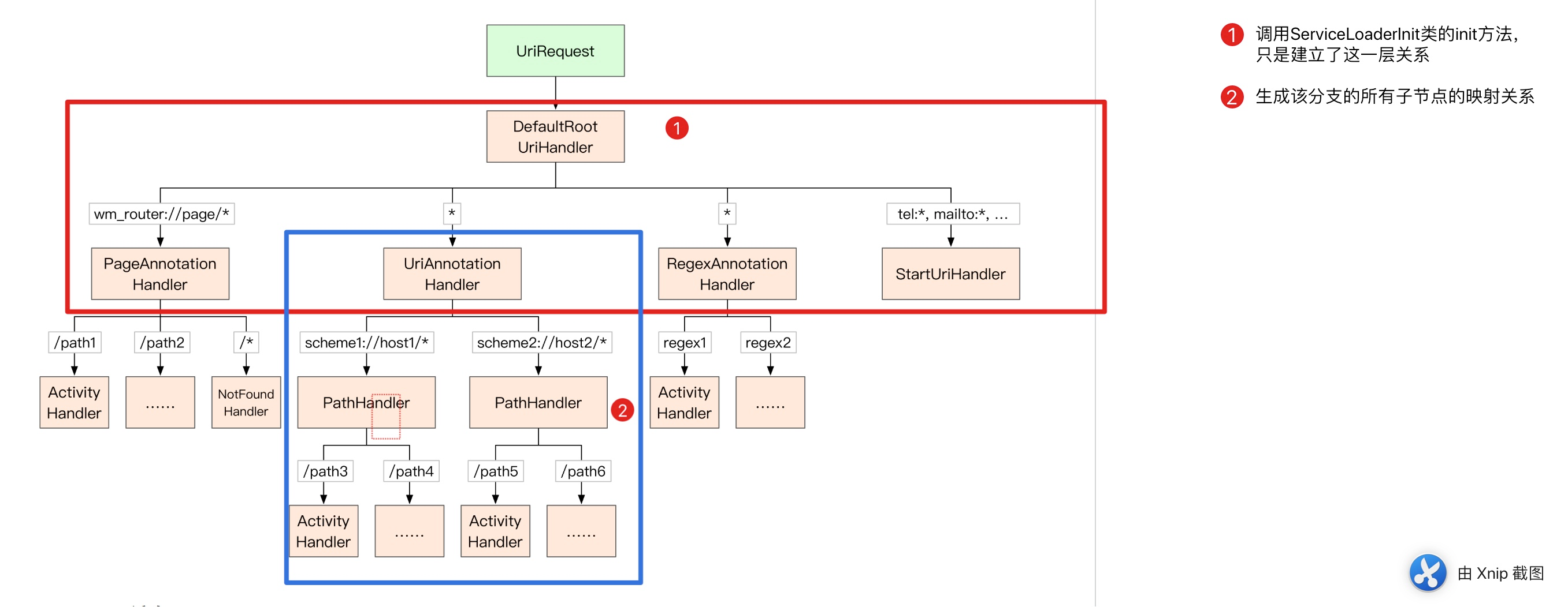ChainedHandler实际上是DefaultRootUriHandler,因为DefaultRootUriHandler是ChainedHandler的子类,而且没有实现handleInternal方法。所以调用的是ChainedHandler的handleInternal方法,最终调用的是next(Iterator<UriHandler> iterator,UriRequest request,UriCallback callback)方法。而该方法中,在某个节点的onNext回调里面又递归调用了其自己,这样就建立了链式关系。 - WMRouter中,UriHandler的若干子类构成了一个责任链,UriInterceptor的若干子类构成了另一个责任链。
