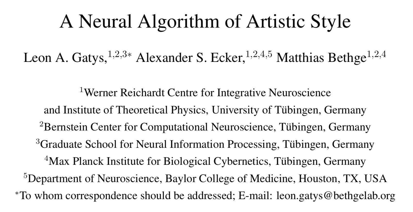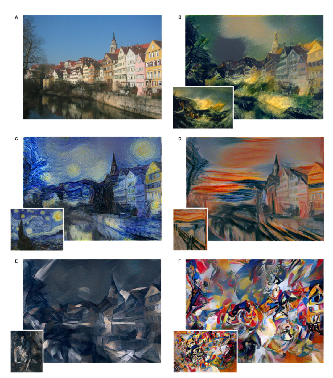 在艺术领域,尤其是绘画创作上,人们已经掌握了一种可以创造独一无二视觉体验的能力,那就是通过将一张图片的内容和风格之间构成某种复杂的关系。到目前为止,该过程的算法基础是未知的,并且不存在具有类似能力的人工系统。然而,受到一种名为深度神经网络的视觉模型的启发,在视觉感知的其他关键领域,例如物体和人脸识别,仿生学的效果已经可以接近人类的表现。这里我们将会介绍一个基于深度神经网络的人工系统,它可以生成具有高感知品质的艺术图片。该系统使用神经表示来分离和重组任意图像的内容和风格,提供了一种创建艺术图像的神经算法。而且,按照要去表现最优的人工神经网络和生物视觉中找到相同.我们的工作提供了人类是怎样创作和认知艺术图像的算法理解。此外,鉴于性能优化的人工神经网络与生物视觉之间惊人的相似性,我们的工作为算法理解人类如何创造和感知艺术形象提供了一条前进的道路。