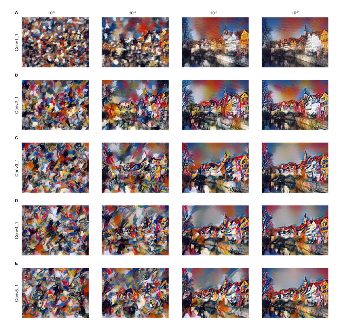正如概述所言,风格表征是一个多层次的表征,包含多层神经网络。在图2中展示的图片中,这个风格表征包括了整个神经网络结构的各个层次。风格也可以被定义为更为局部化,因为它只包含了少量的低层结构。这些结构能产生不同的视觉效果(图3,along the rows)。若符合了较高层级中的风格表征,局部的图像结构会大规模地增加,从而使得图像在视觉上更平滑与连贯。因此,看起来美美的图片通常是来自于符合了较高层级的风格表征。