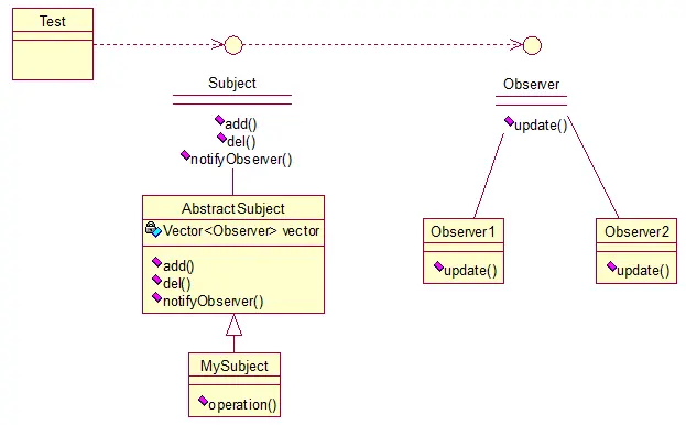 我解释下这些类的作用:MySubject类就是我们的主对象,Observer1和Observer2是依赖于MySubject的对象,当MySubject变化时,Observer1和Observer2必然变化。AbstractSubject类中定义着需要监控的对象列表,可以对其进行修改:增加或删除被监控对象,且当MySubject变化时,负责通知在列表内存在的对象。我们看实现代码: