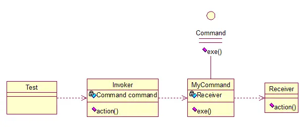 Invoker是调用者(司令员),Receiver是被调用者(士兵),MyCommand是命令,实现了Command接口,持有接收对象,看实现代码: