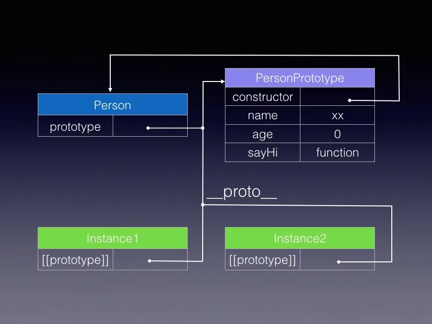 prototype指向了Object实例。让我们更新下上面的关系图: -