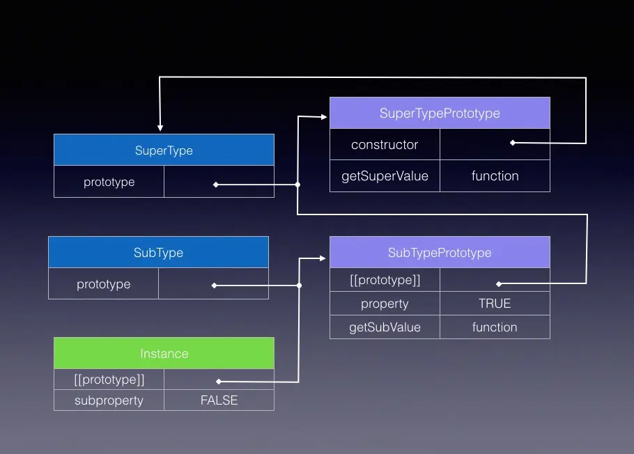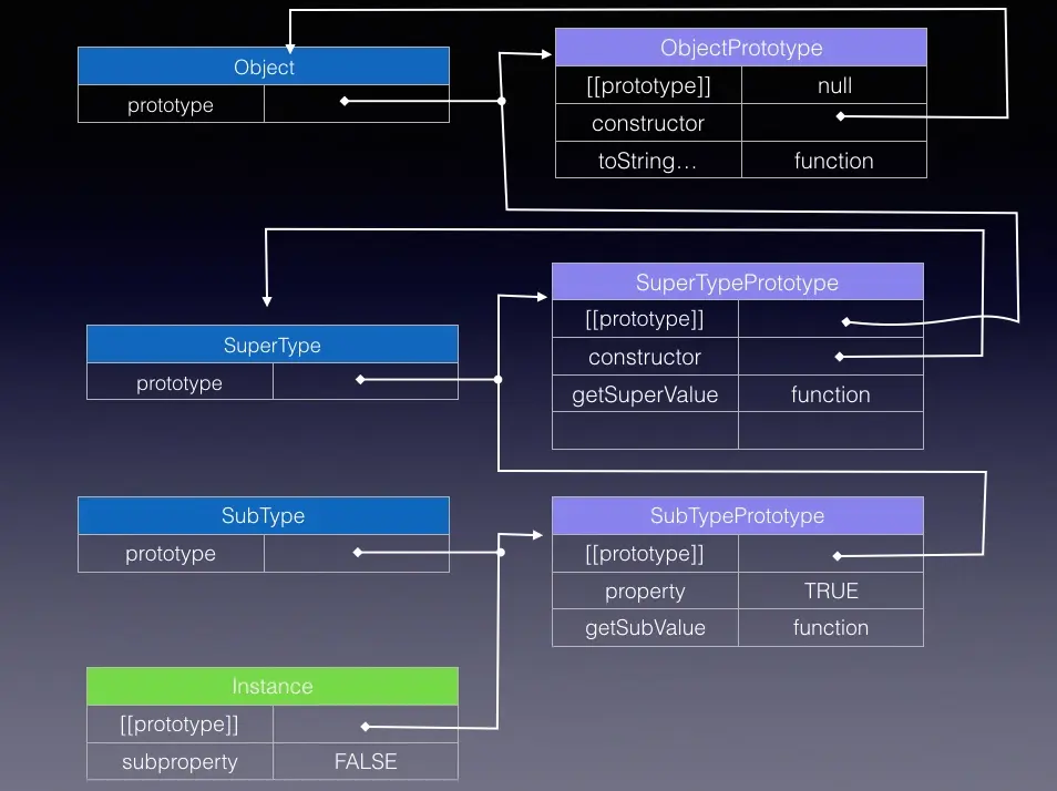 // 子类型的prototype指向父类型的实例对象,完成继承