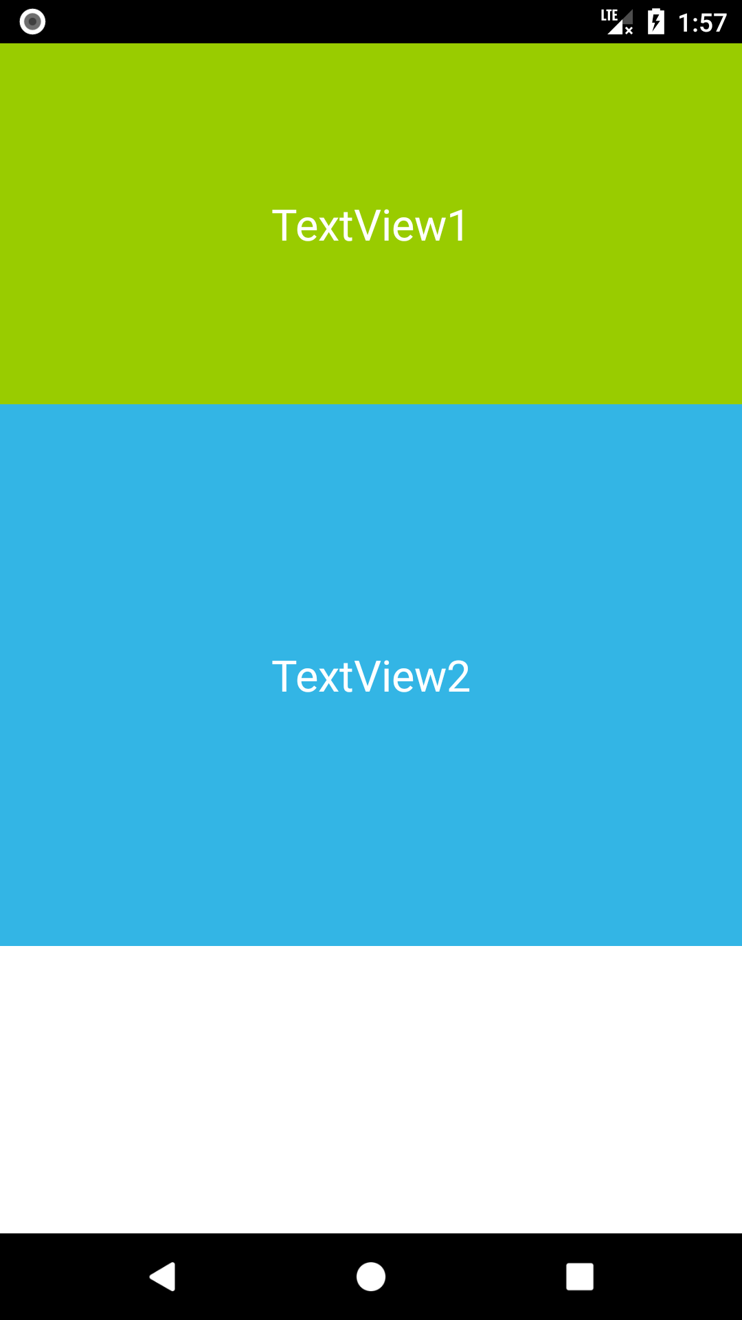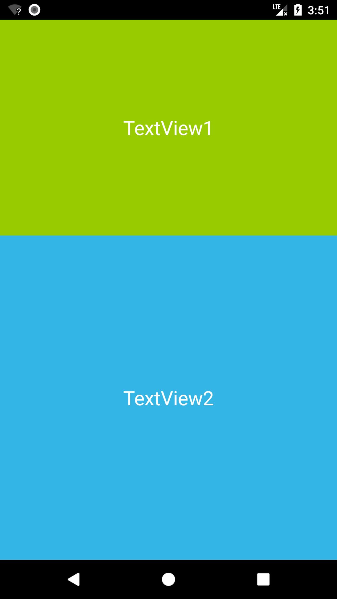 <LinearLayout xmlns:android="http://schemas.android.com/apk/res/android" android:layout_width="match_parent" android:layout_height="match_parent" android:orientation="vertical"> <TextView android:layout_width="match_parent" android:layout_height="200dp" android:text="TextView1" android:gravity="center" android:textSize="24sp" android:textColor="@android:color/white" android:background="@android:color/holo_green_light"/> <TextView android:layout_width="match_parent" android:layout_height="300dp" android:text="TextView2" android:gravity="center" android:textSize="24sp" android:textColor="@android:color/white" android:background="@android:color/holo_blue_light"/></LinearLayout>