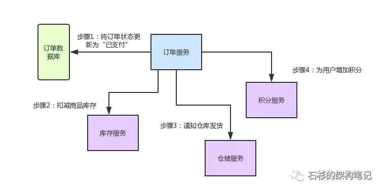 用户针对一个订单完成支付之后,就会去找订单服务,更新订单状态