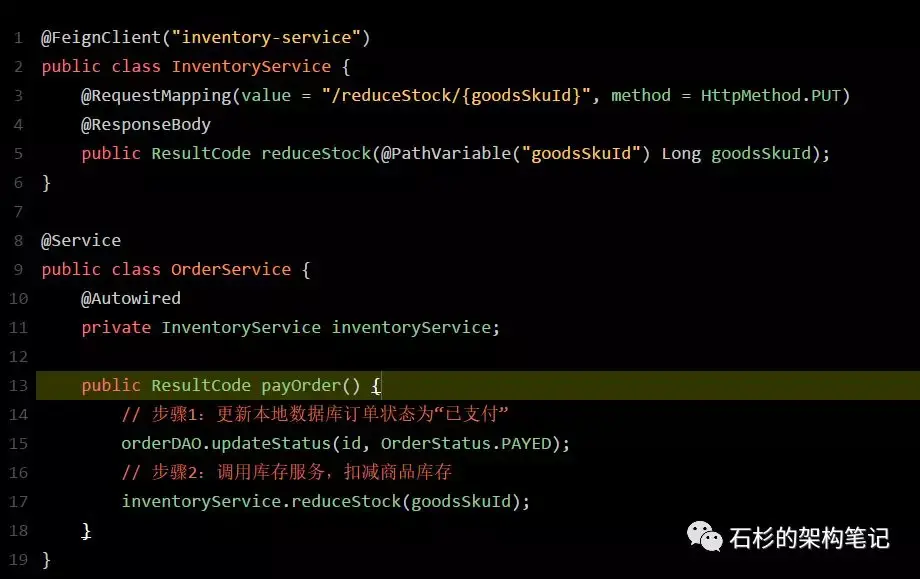 既然如此,那怎么办呢?别急,Feign早已为我们提供好了优雅的解决方案。来看看如果用Feign的话,你的订单服务调用库存服务的代码会变成啥样?