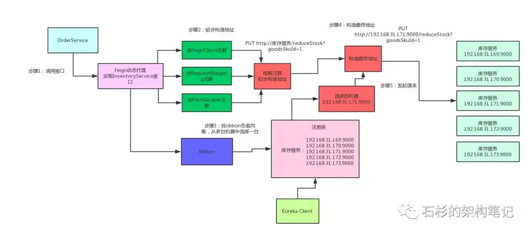 说完了Feign,还没完。现在新的问题又来了,如果人家库存服务部署在了5台机器上,如下所示: