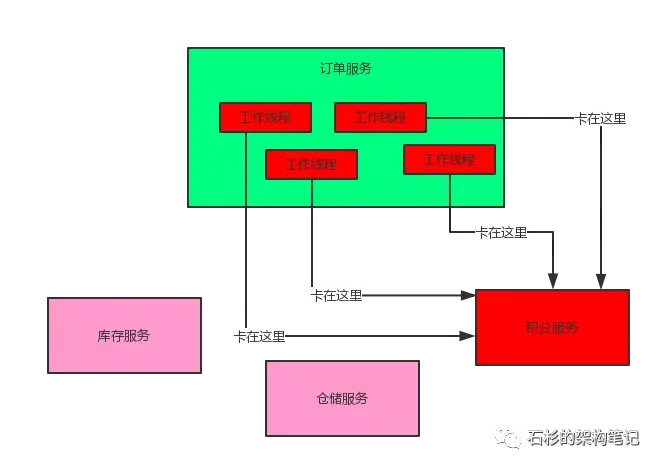 当然会导致订单服务里的那个用来调用积分服务的线程都卡死不能工作了啊!但是由于订单服务调用库存服务、仓储服务的这两个线程池都是正常工作的,所以这两个服务不会受到任何影响。