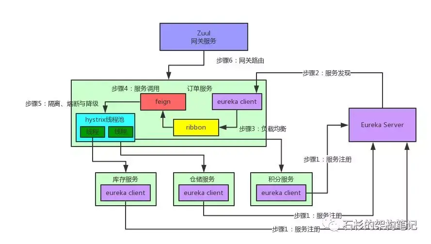 好!有了业务场景之后,咱们就一起来看看Spring Cloud微服务架构中,这几个组件如何相互协作,各自发挥的作用以及其背后的原理。