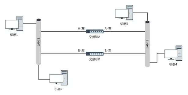 如下图。当两个交换机环路连接两个局域网时,你知道会出现什么结果吗?