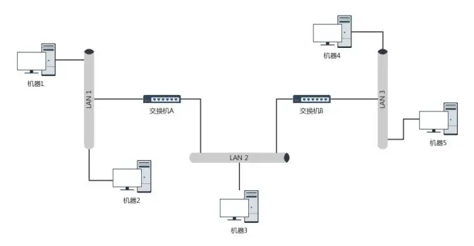 - 在局域网一,交换机 A、B 收到机器 1 的广播包后,知道机器 1 都是在左网口