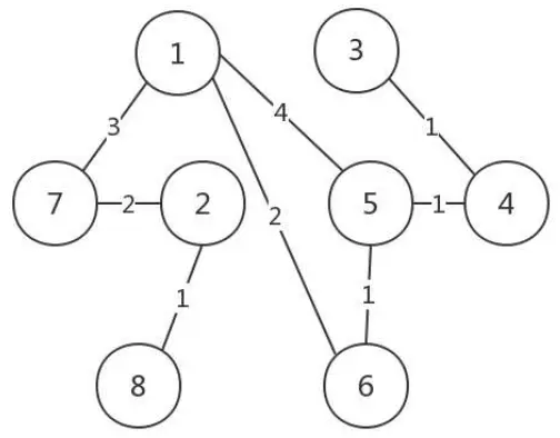 数字表示优先级。就像上面的图,5 和 6 碰见了,6 的优先级低(数字越小,优先级越高),所以乖乖做小弟。于是,一个小门派形成,5 是掌门,6 是小弟。其他诸如 1-7、2-8、3-4 这样的小门派也诞生了。接着,这些小的门派就好相互合并。