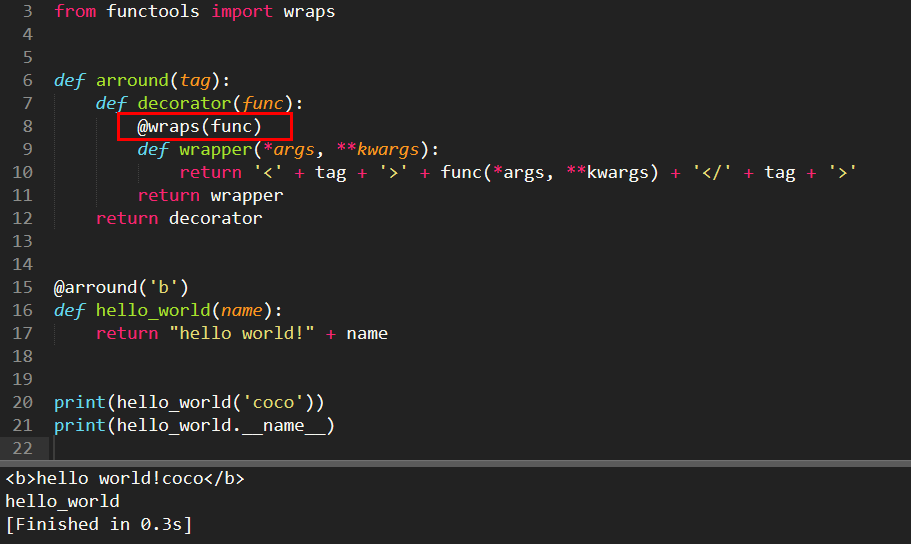 hello_world被装饰之后,打印了函数名,名称变成了wrapper。