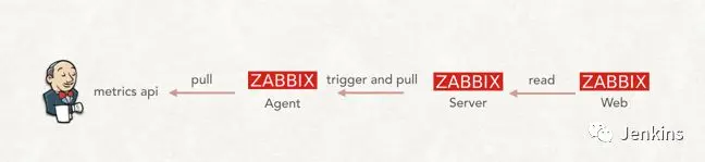 笔者最近的工作涉及到使用 Zabbix 监控 Jenkins。在谷歌上搜索到的文章非常少,能操作的就更少了。所以决定写一篇文章介绍如何使用 Zabbix 监控 Jenkins。 下图为整体架构图: