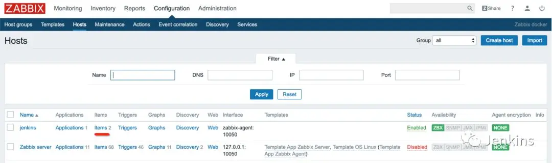 Zabbix server 通过与 Zabbix agent 进行通信实现数据的采集。而 Zabbix agent 又分为被动和主动两种模式。我们使用的是被动模式,也就是Zabbix server 向 agent 索要数据。 所以,我们需要在 Zabbix agent 所在机器放一个获取 Jenkins 指标数据的脚本。再配置 Zabbix server 定时从该 agent 获取数据,最后配置触发器(trigger)实现告警。 接下来的关于 Zabbix 的配置,基于我的 jenkins-zabbix 实验环境,读者朋友需要根据自己的实际情况变更。