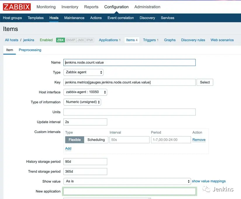 UserParameter=jenkins.metrics[*], python /usr/lib/zabbix/externalscripts/jenkins.metrics.py $1 根据 Key 名称(jenkins.metrics)找到相应的命令,即:python /usr/lib/zabbix/externalscripts/jenkins.metrics.py $1。并执行它,同时将参数 gauges.jenkins.node.count.value.value 传入到脚本 jenkins.metrics.py 中。jenkins.metrics.py 需要我们在 Jenkins agent 启动前放到 /usr/lib/zabbix/externalscripts/ 目录下。 jenkins.metrics.py 的源码在 jenkins-zabbix 实验环境中可以找到,篇幅有限,这里就简单介绍一下其中的逻辑。 jenkins.metrics.py 所做的事情,无非就是从 Jenkins master 的 metrics api 获取指标数据。但是由于 api 返回的是 JSON 结构,并不是 Zabbix server 所需要的格式。所以,jenkins.metrics.py 还做了一件事情,就是将 JSON 数据进行扁平化,比如原来的数据为:{"gauges":{"jenkins.node.count.value": { "value": 1 }}} 扁平化后变成: gauges.jenkins.node.count.value.value=1。 如果 jenkins.metrics.py 脚本没有接收参数的执行,它将一次性返回所有的指标如: