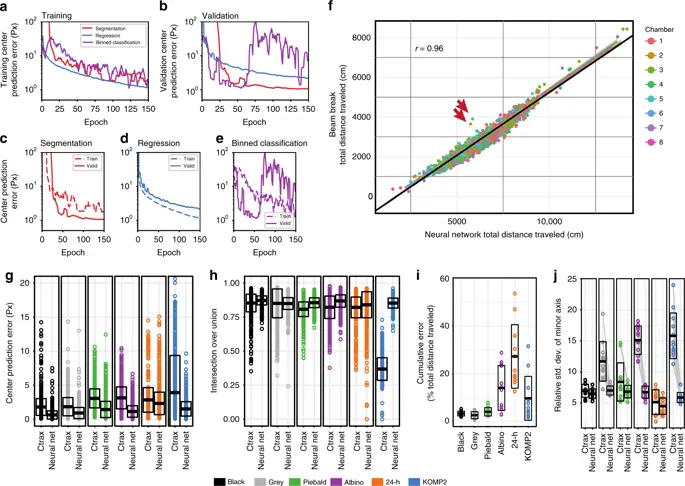 他们针对不同的小鼠和不同的环境条件,比较了三种不同的神经网络结构在视觉上的效果。第一种体系结构是编码器 - 解码器分割网络,第二种网络架构是分箱分类网络,第三种架构是回归网络。