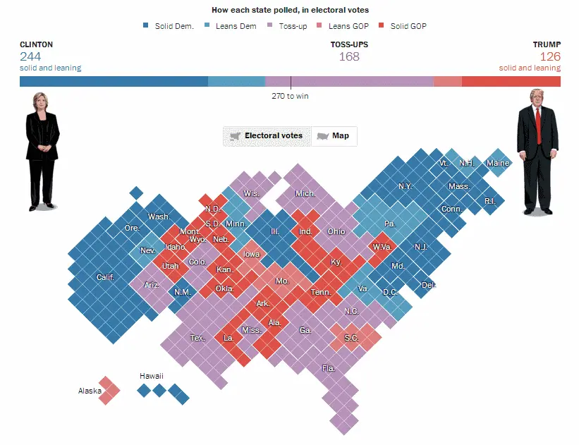 图为美国各洲“选举人票”的占比情况。作者设计了两种表现方法,一是以“选举人票”的分布做为底图,一是直接以美国地图作为底图。除此图上方双方选举人票总体数量对比外,鼠标移至各洲上方还能显示各洲“选举人票”数量及对希拉里与特朗普的支持比例。