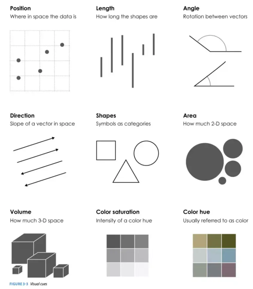 数据的可视化由最基础的元素组成,就像邱南森《数据之美》提到9大元素:位置、长度、角度、方向、形状、纹理、面积、色相、饱和度。