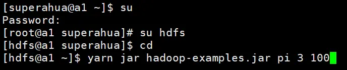 sudo -u hdfs yarn jar hadoop-examples.jar pi 3 100
