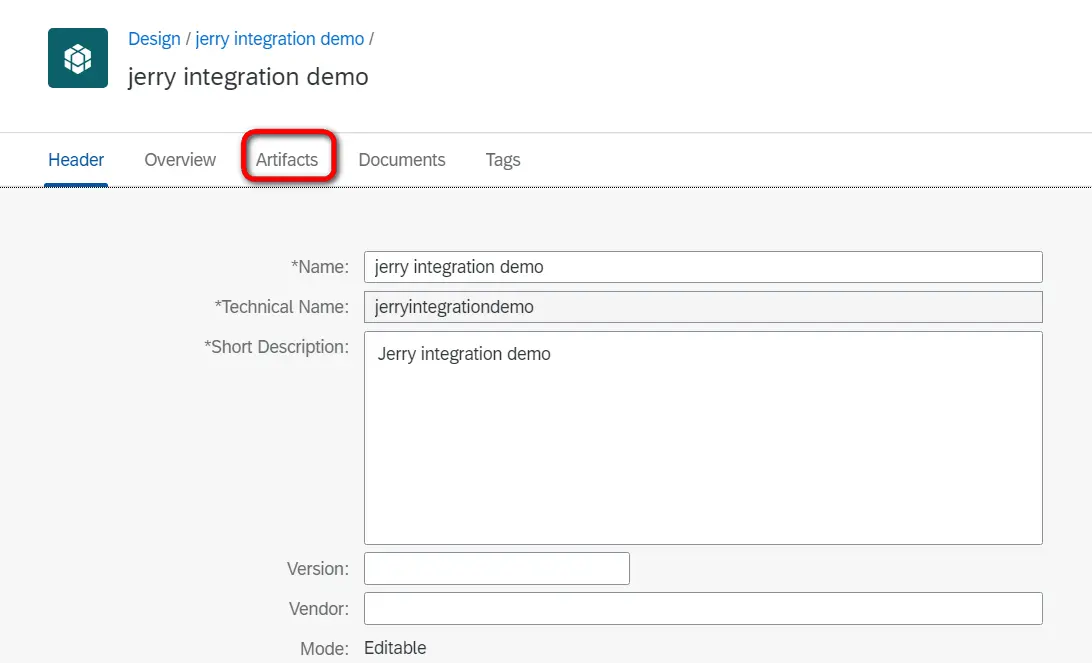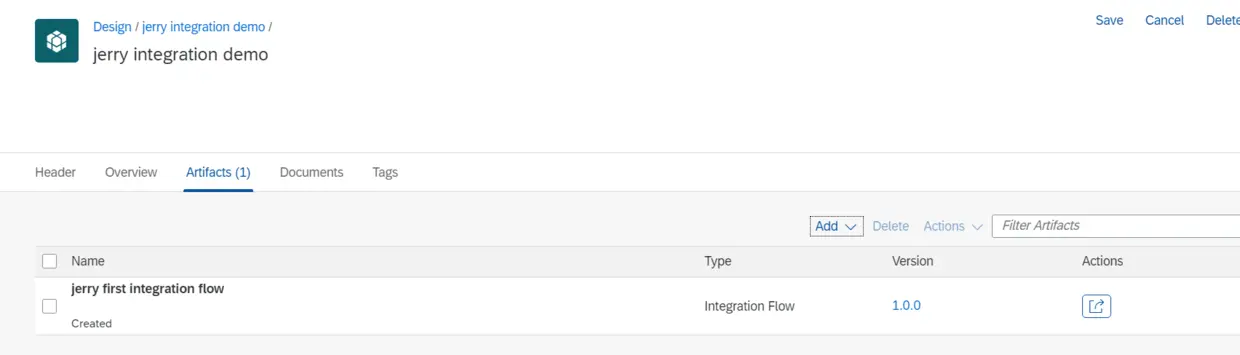 保存content package后,点击artifacts标签页,此处创建integration flow: