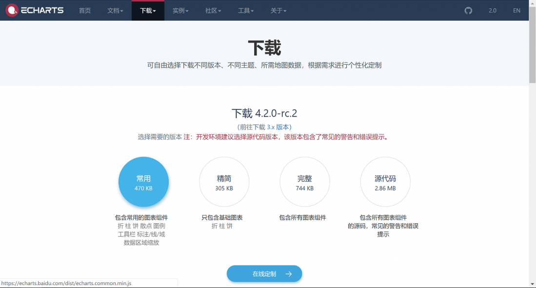 在使用Echarts之前呢,我们需要先去官网下载最新版本的Echarts的依赖包(),在这呢,我推荐大家下载源代码,因为你源代码里面包含了所有图表组件以及常见的警告和错误.如果你觉得源代码文件太大,而且项目中用到的图表功能很简单的话呢,那就使用精简版的好啦.