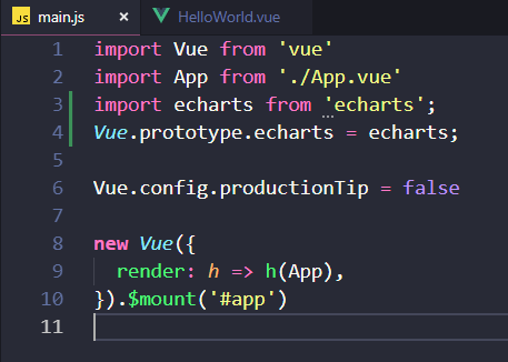 在main.js里面导入echarts依赖包,再将echarts实例化函数设为vue的原型函数,便于全局访问,代码如下图:
