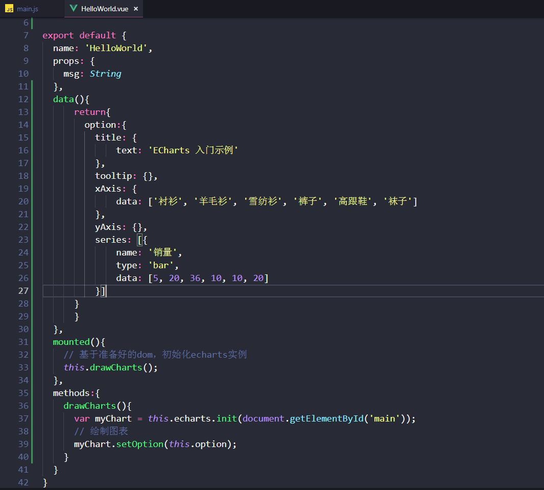 然后在HelloWorld.vue的template里面添加标签<div id="main" style="width: 600px;height:400px;"></div>;