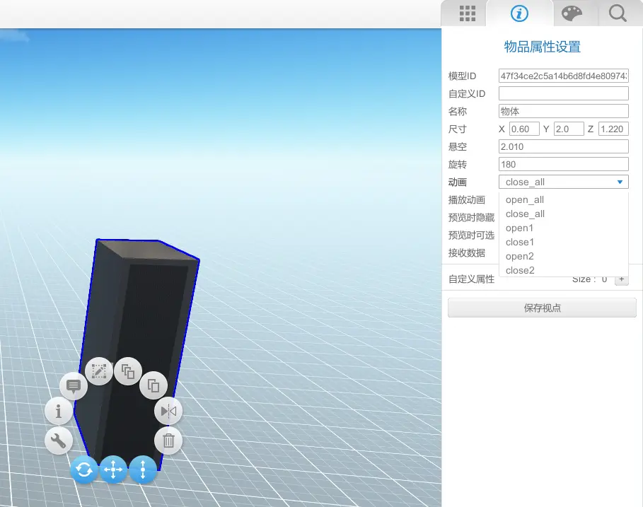 在CamBuilder中我们可以通过选中该模型,查看模型是否带有动画,例如这个机柜动画名为‘close_all’,‘open_all’,‘open1’,‘close1’,‘open2’和‘close2’,控制机柜开关柜门动画。