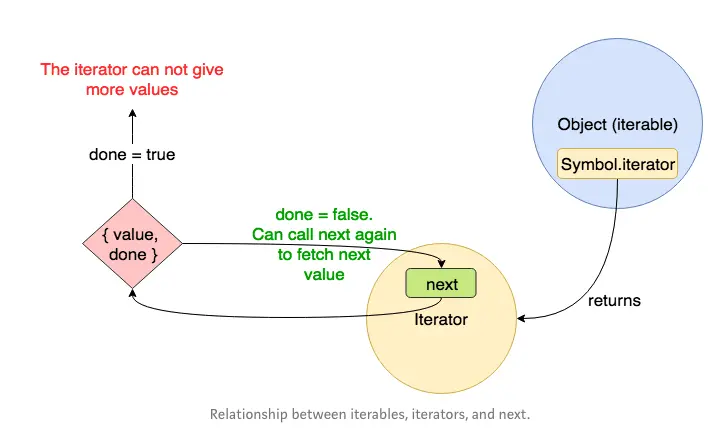- 可迭代的数据结构是指外部可以获取它内部元素的数据结构,实现的方法是通过提供 Symbol.iterator 方法,这个方法是迭代器的构造函数,可以生成迭代器。